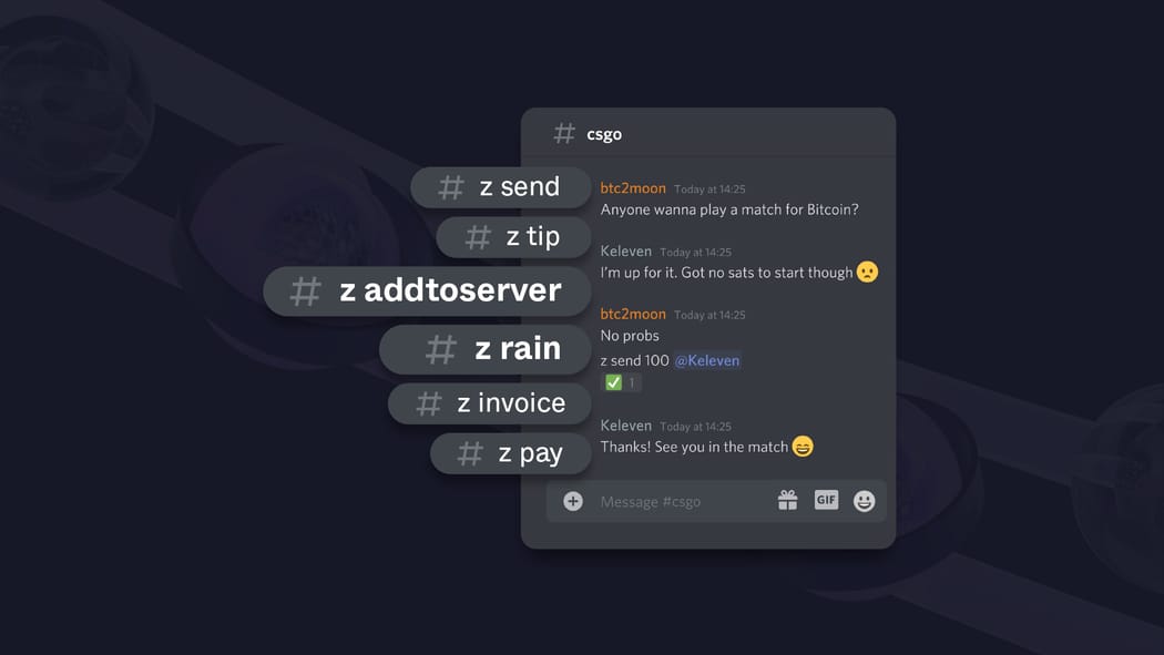 - Send Bitcoin to another person in the chat by typing z send <amount> @username